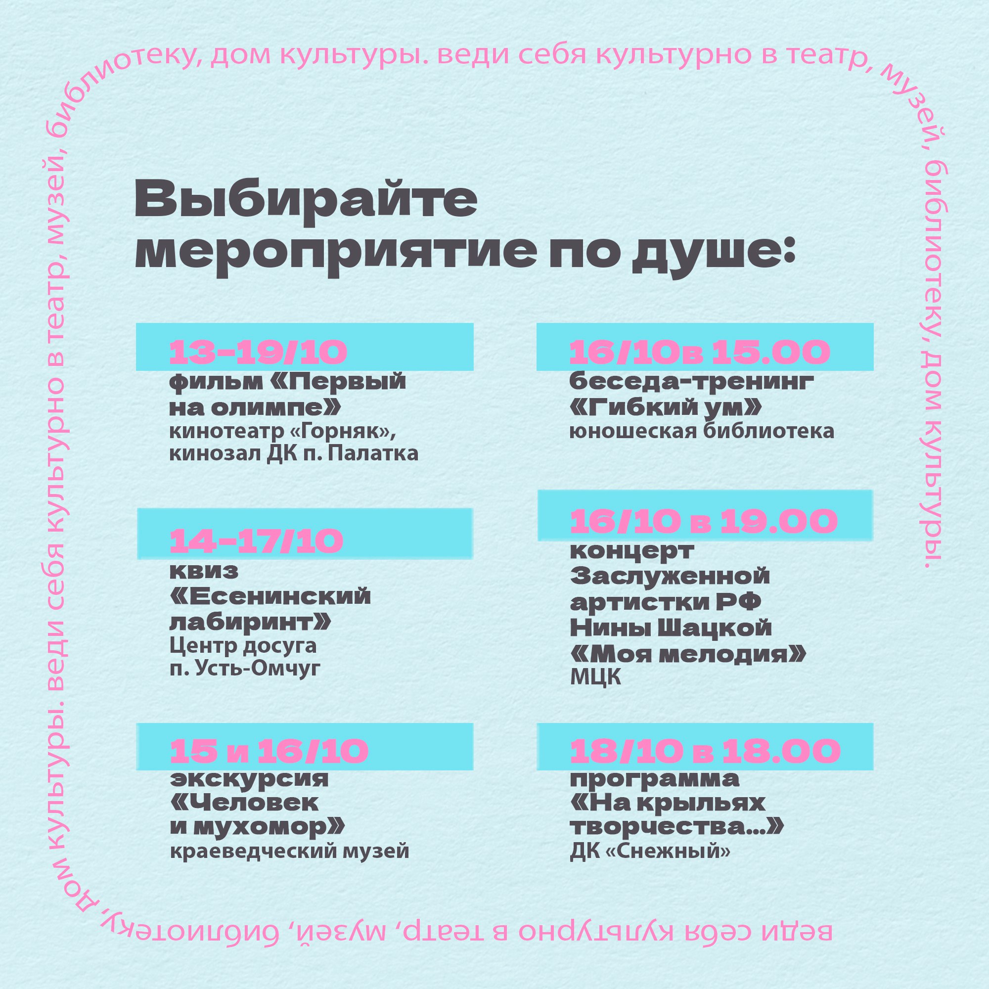 Минкульт Колымы представляет подборку интересных событий, которые можно посетить с Пушкинской картой на неделе с 13 по 19 октября. Больше событий вы найдете по ссылке clck.ru/ey5dT.