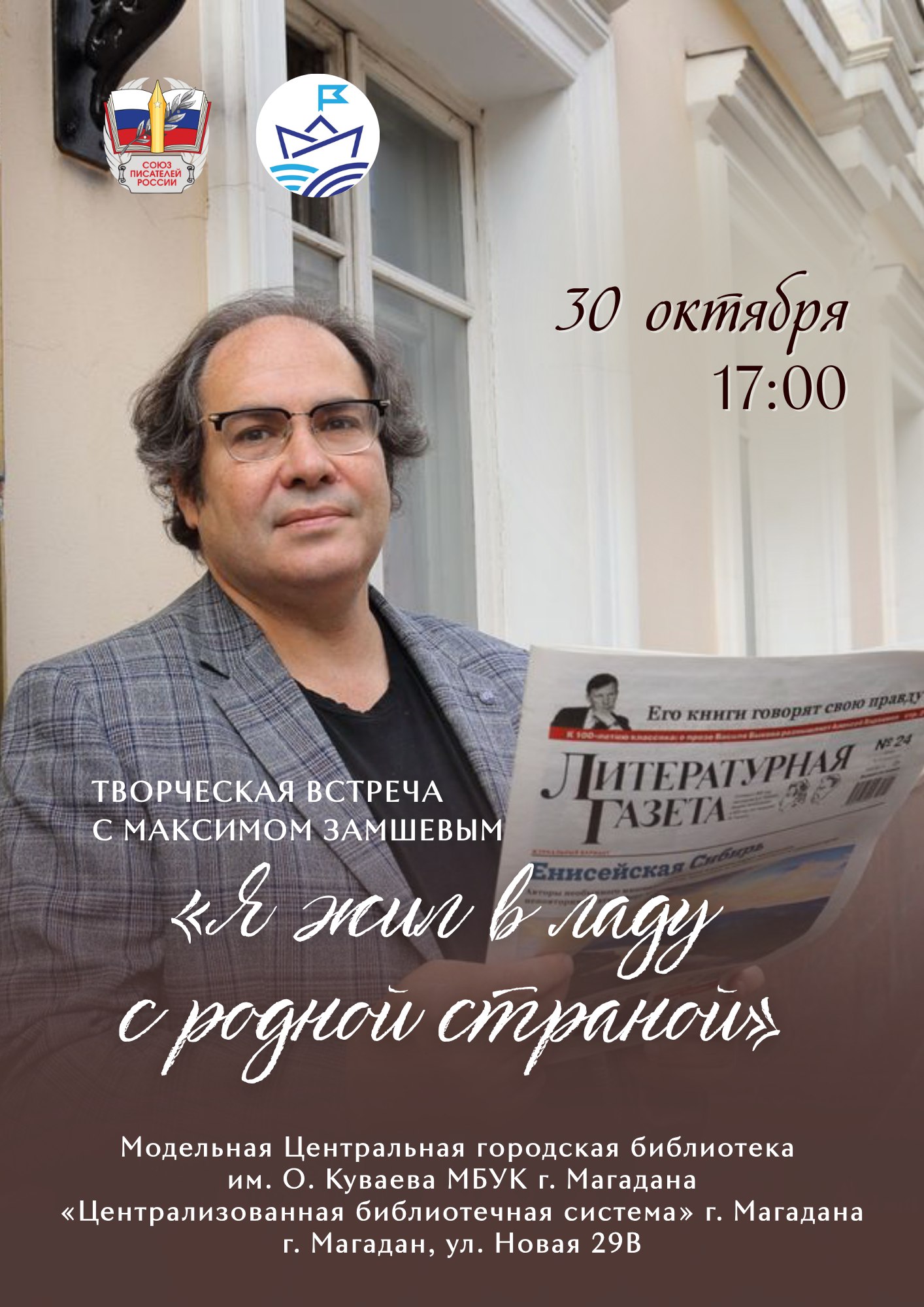 В Магадане состоится творческая встреча с Максимом Замшевым – прозаиком, поэтом, литературным критиком, переводчиком с румынского и сербского языков, главным редактором «Литературной газеты», членом Правления Союза писателей России.