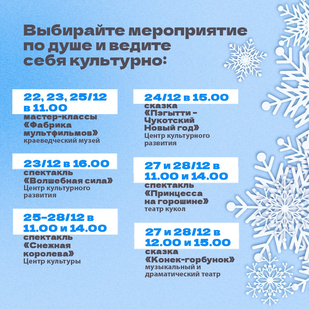Минкульт Колымы представляет подборку интересных событий, которые можно посетить на неделе с 22 по 28 декабря.