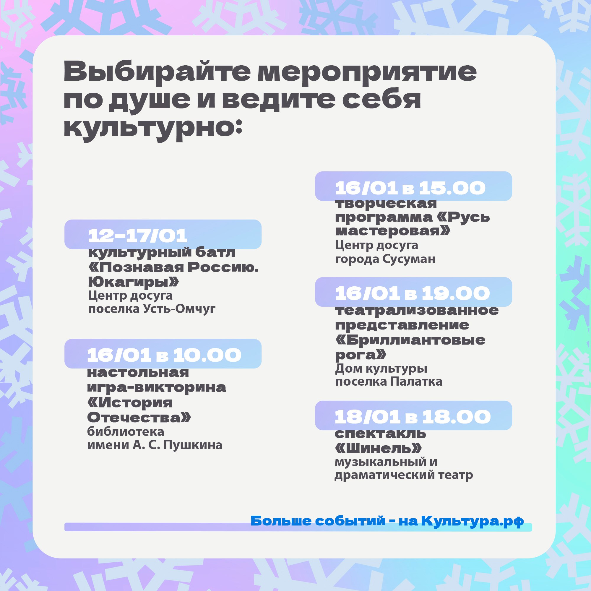 Минкульт Колымы представляет подборку интересных событий, которые можно посетить на неделе с 12 по 18 января с Пушкинской картой.