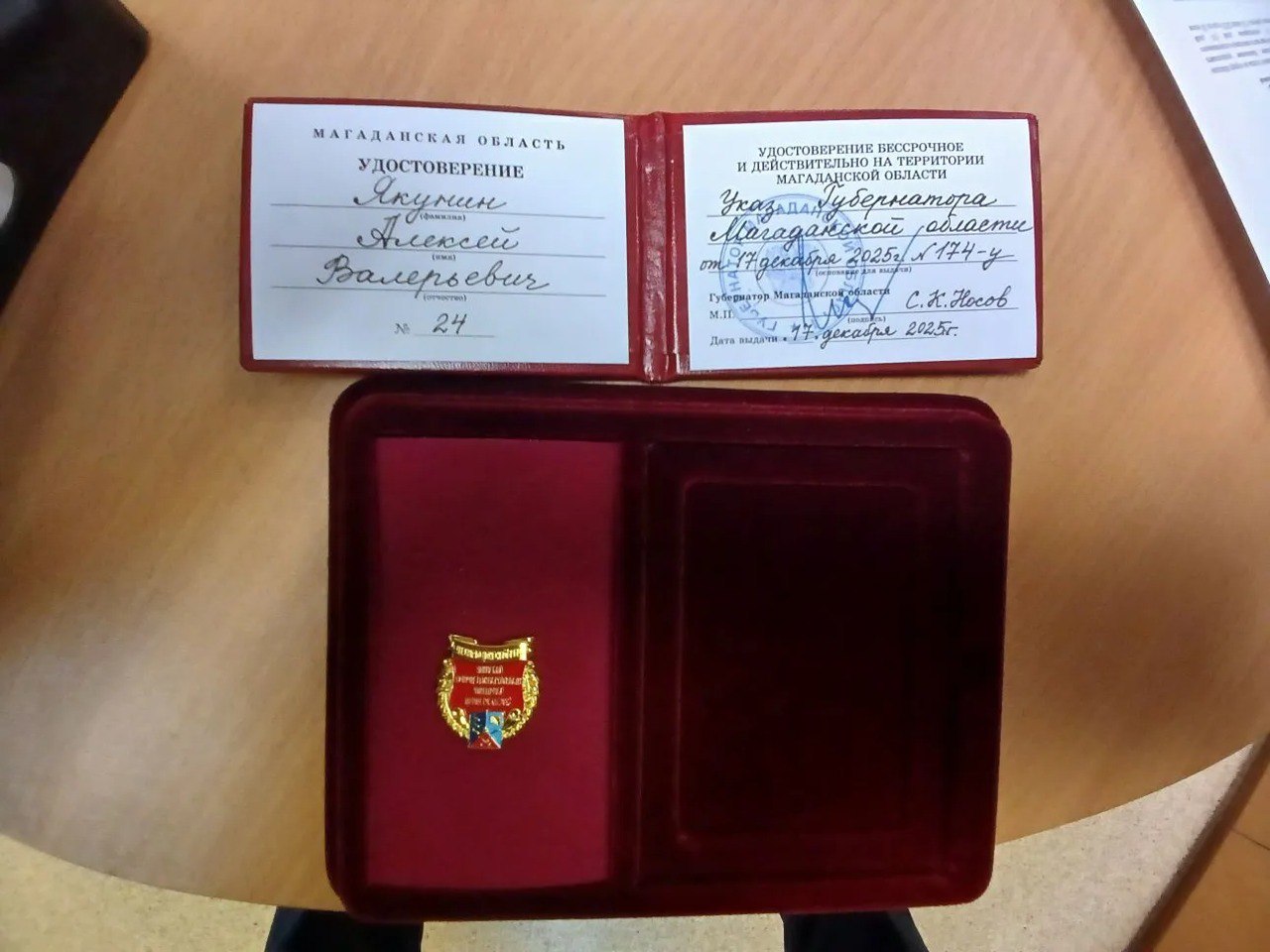 Удостоверение и медаль Алексею Якунину вручил губернатор Магаданской области – Сергей Носов.