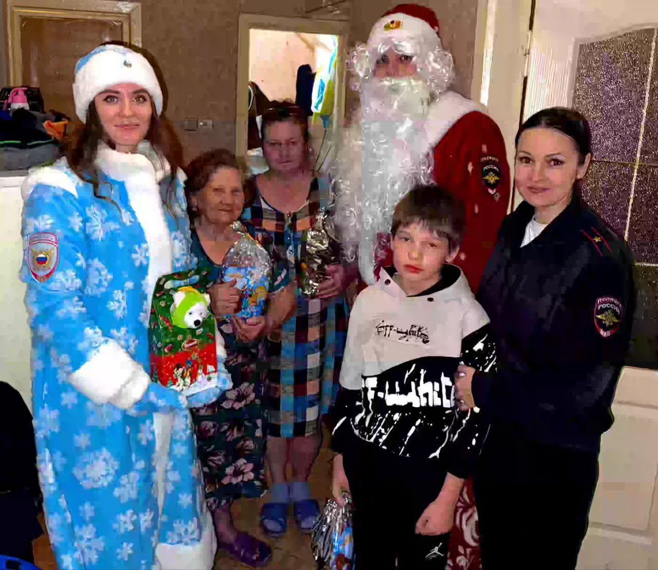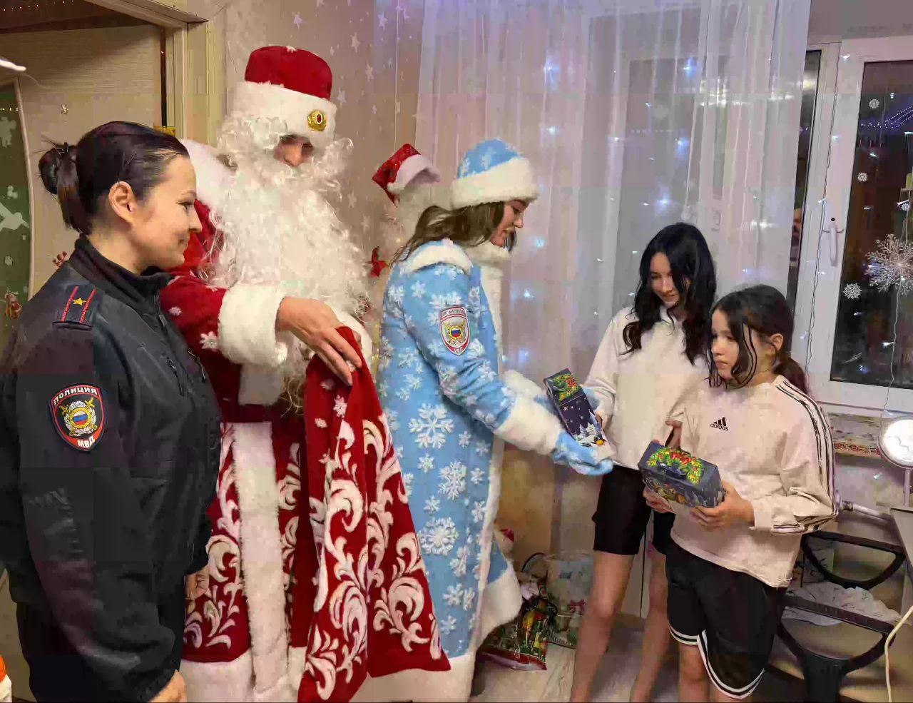 Дедушка Мороз – инструктор профподготовки Антон Мисиюк, Снегурочка – инспектор ПДН Елена Шадрина, и старший инспектор ПДН Анна Светова.