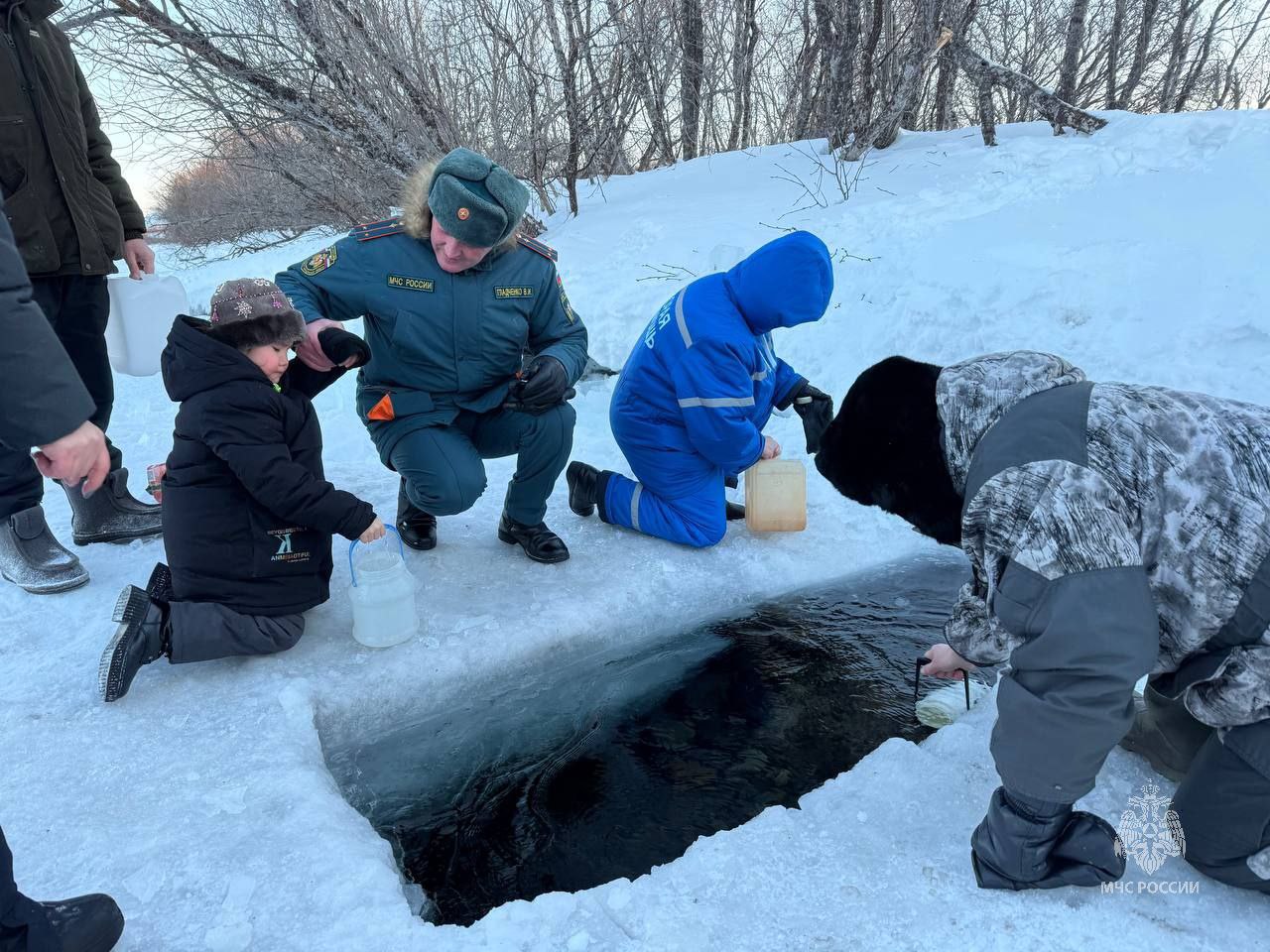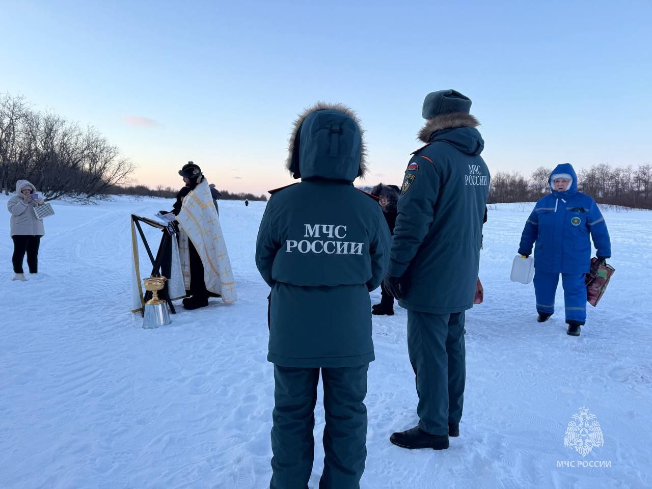 В п. Эвенск провели чин освящения воды. Сотрудники МЧС и представители других ведомств заступили на дежурство для обеспечения безопасности.