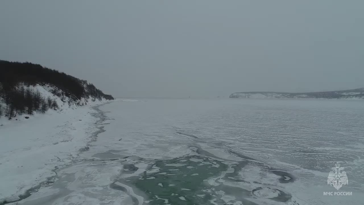 Сотрудники МЧС России мониторинг ледовой обстановки в прибрежных акваториях с применением беспилотного летательного аппарата. Обследование показало, что устойчивый ледовый покров в бухтах, прилегающих к Магадану, еще не сформировался.