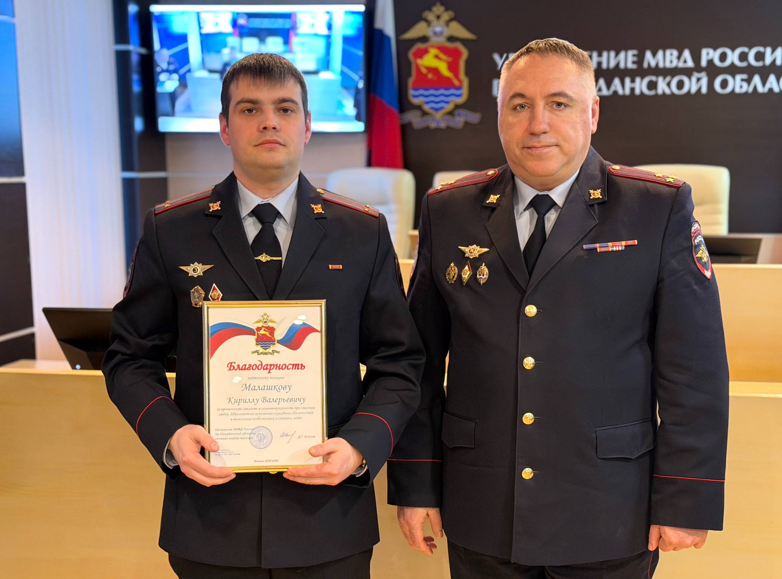 Сегодня в УМВД России по Магаданской области заместитель начальника Управления начальник полиции Сергей Могилевич вручил благодарности сотрудникам патрульно-постовой службы за проявленную смелость и самоотверженность при спасении людей.