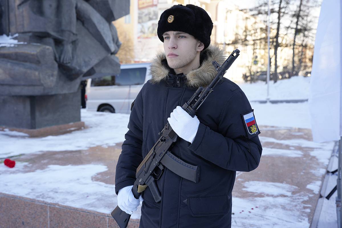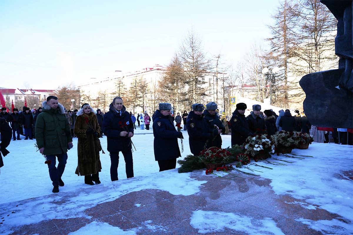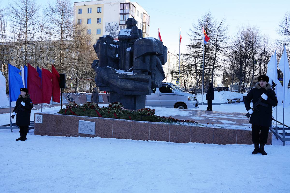 В Магадане в преддверии Дня защитника Отечества у монумента «Узел памяти», посвященного героям фронта и тыла Великой Отечественной войны, состоялась церемония возложения цветов.