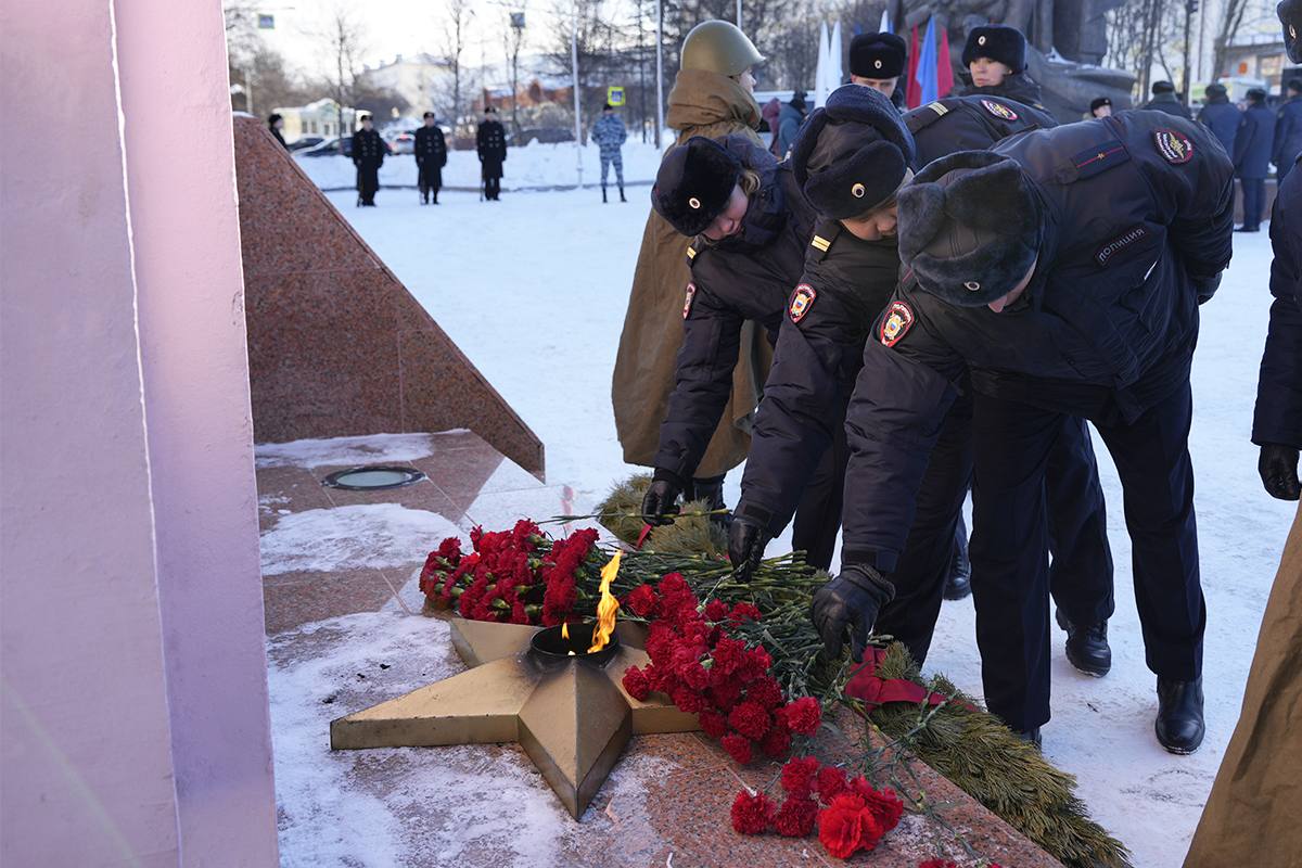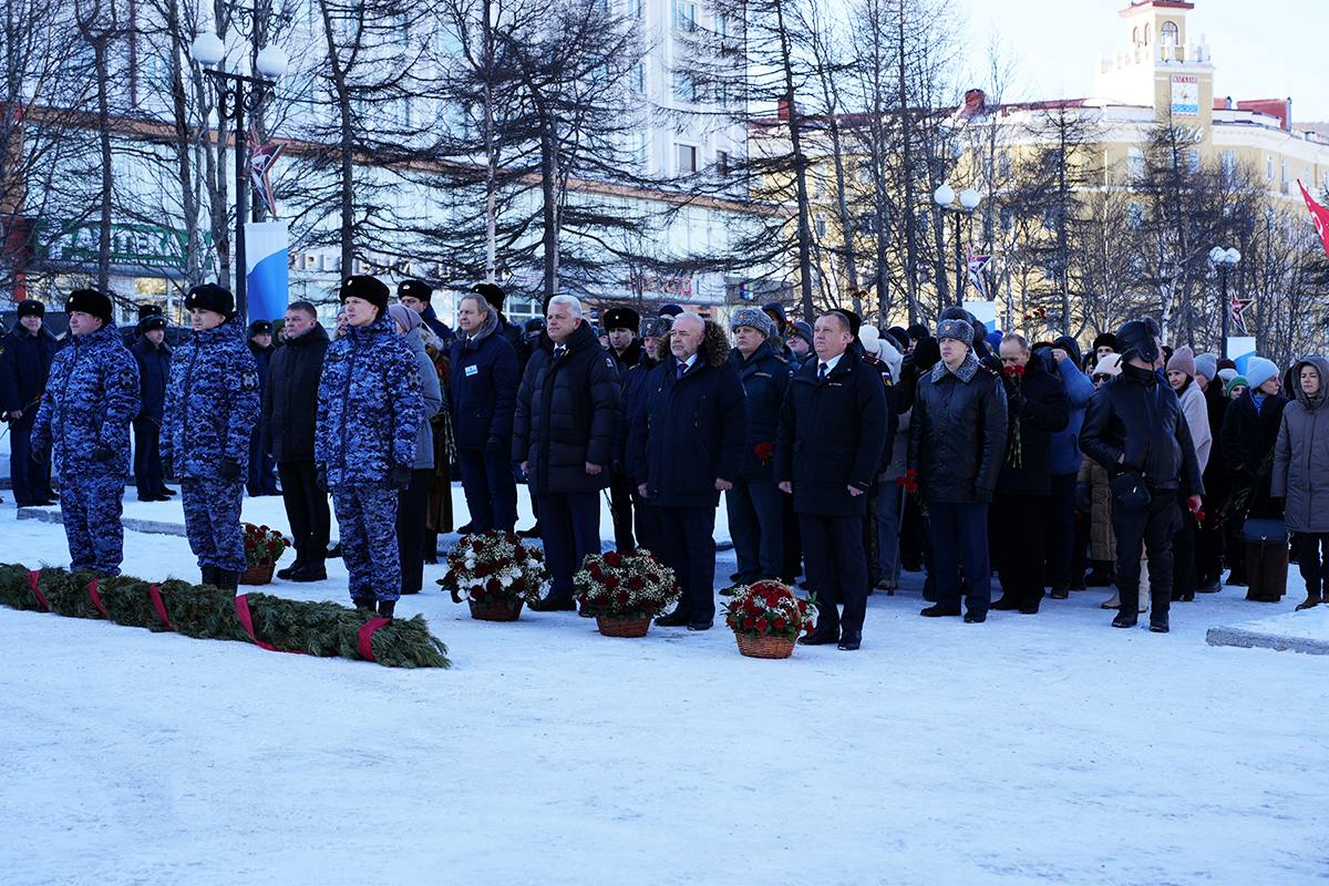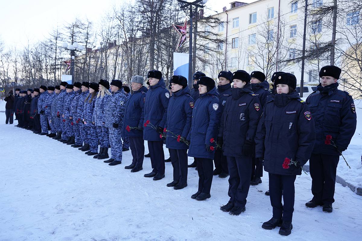 В Магадане полицейские возложили цветы к монументу «Узел памяти» в преддверии Дня защитника Отечества