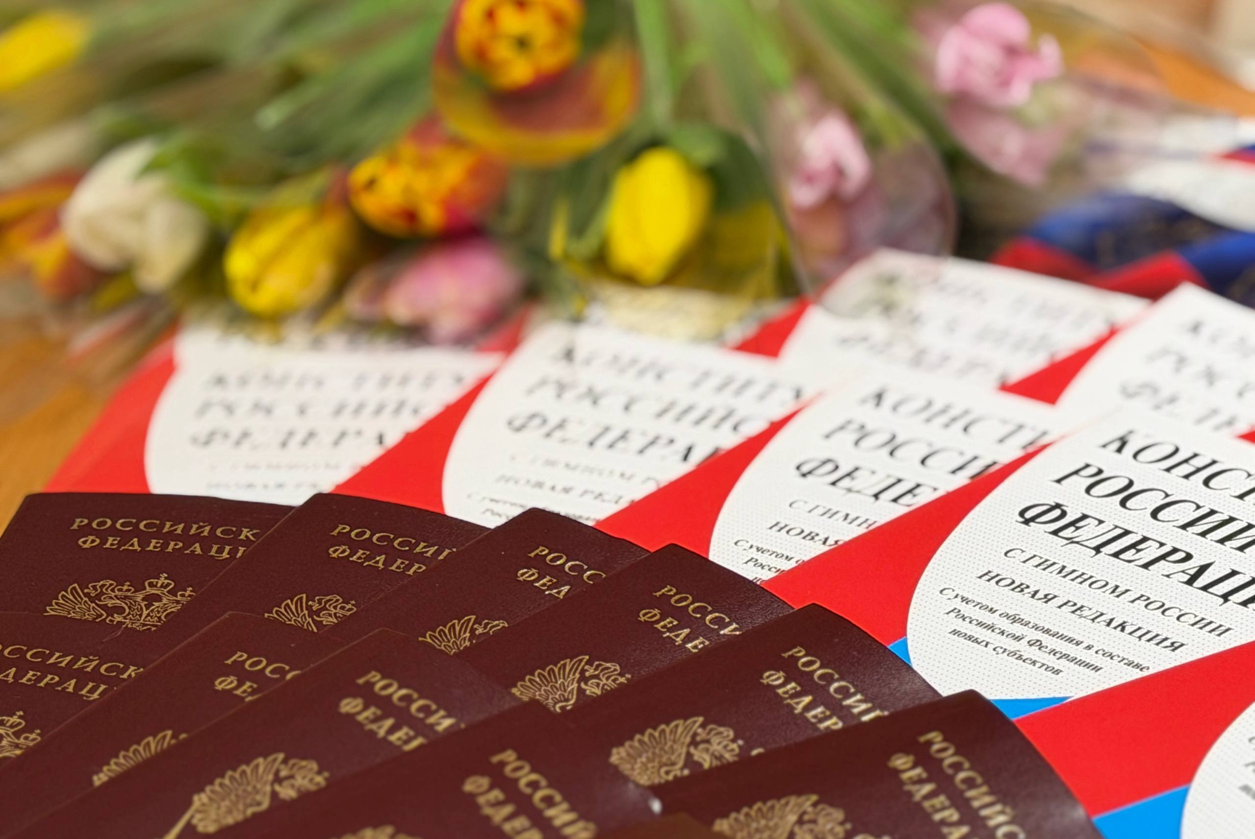 Начальник отдела по вопросам миграции Надежда Белых и член Общественного совета при региональном Управлении МВД России Илья Невижин вручили девушкам паспорт и Конституцию Российской Федерации.