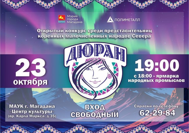 В следующий четверг, 23 октября, в 19.00 в магаданском Центре культуры состоится открытый конкурс среди представительниц коренных малочисленных народов Севера «Дюран-2025» (0+), сообщают в мэрии колымской столицы: