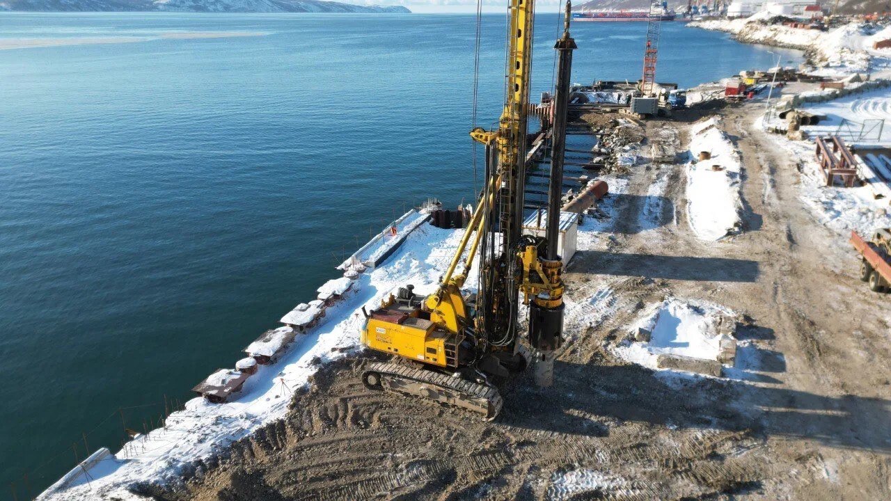 На оградительном моле идут работы нулевого и первого цикла. Организованы временные технологические площадки для размещения сверхтяжелой техники.