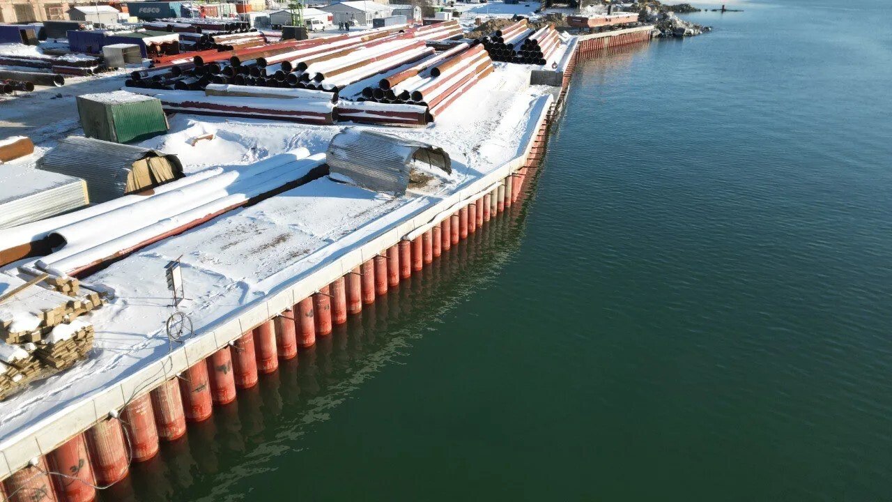 На слипе ведутся основные работы - буровые операции для будущей шпунтовой стенки, отсыпка тела слипа скальным грунтом, погружение свай. Железобетонные и металлические элементы слипа завезены и готовы к монтажу.