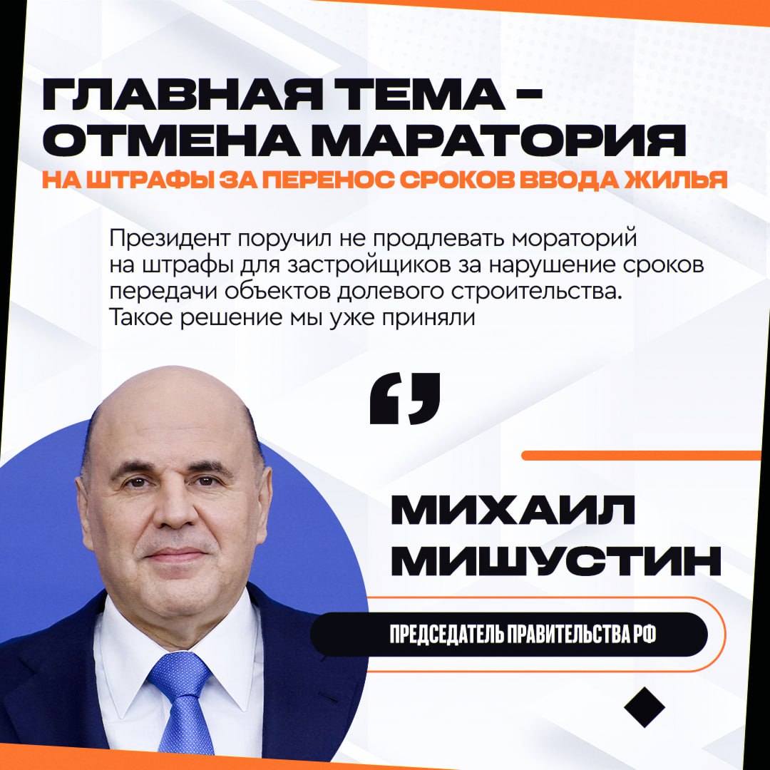 По поручению Президента было принято ключевое решение в сфере жилищного строительства: мораторий на штрафы для застройщиков, нарушающих сроки сдачи объектов, продлеваться не будет.