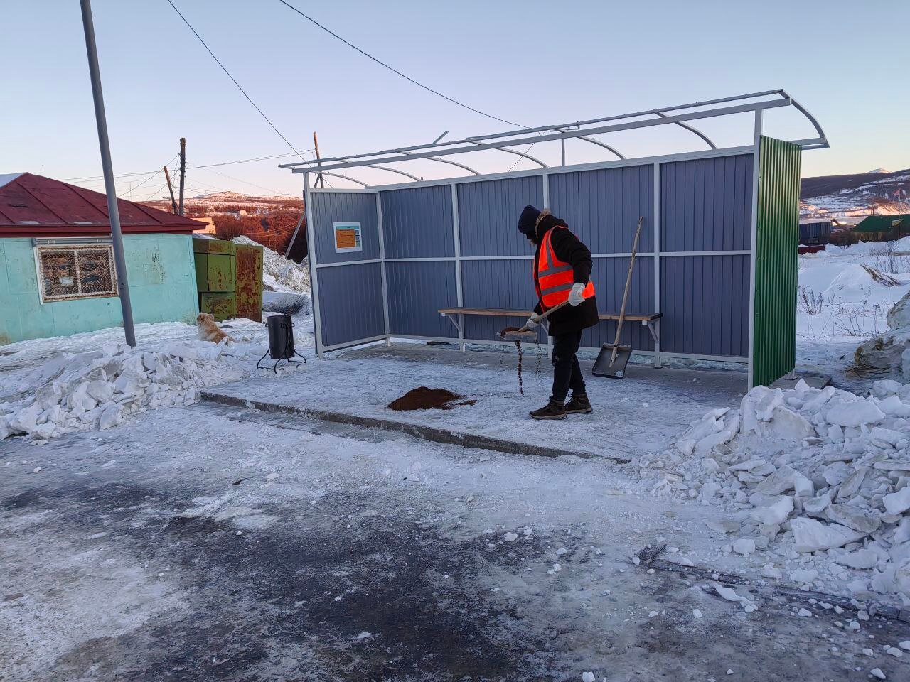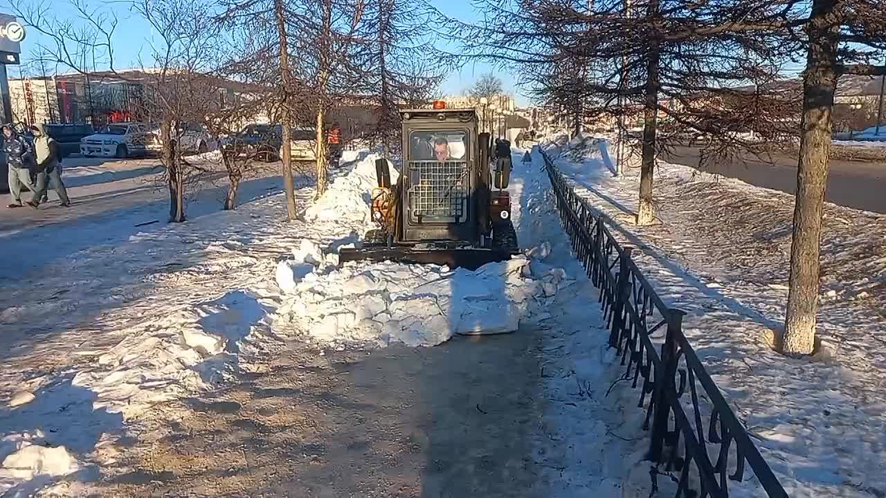 погрузчики КЗХ направлены на расчистку и снятие наката с тротуаров и перекрестков на Полярной, Лукса, Кольцевой, Колымском шоссе и в Пригородном.