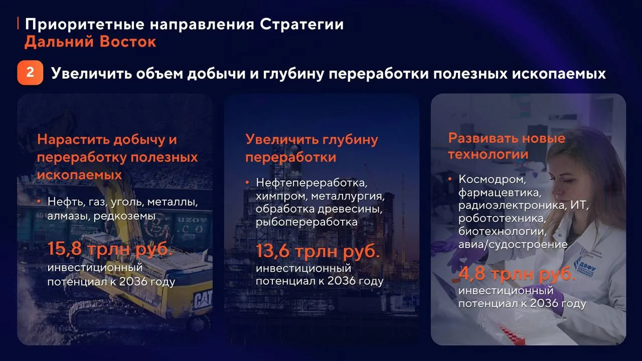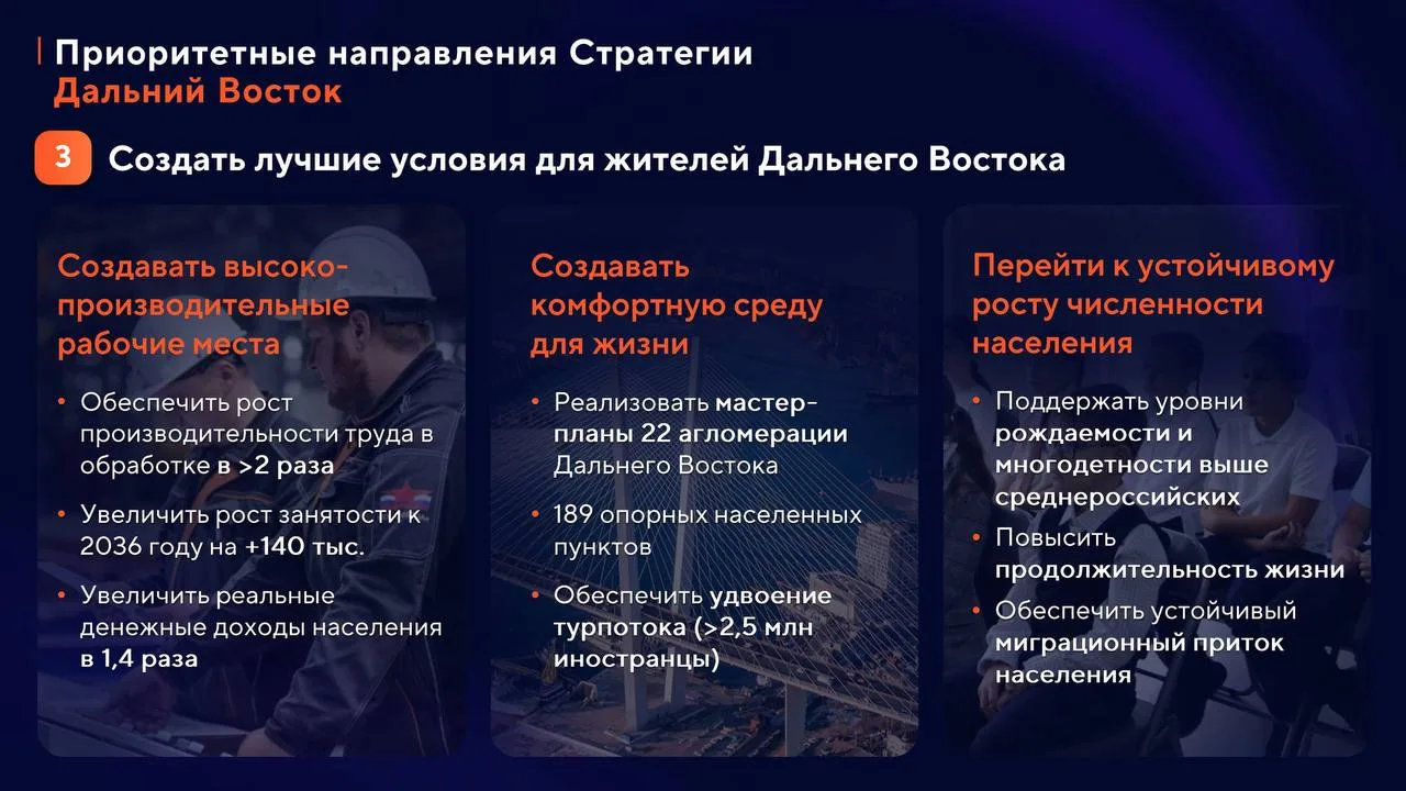 Работа и экономика. Запуск крупных производств, развитие обрабатывающей промышленности и высоких технологий — от судостроения до электроники. Это новые рабочие места и возможность строить карьеру на Дальнем Востоке.