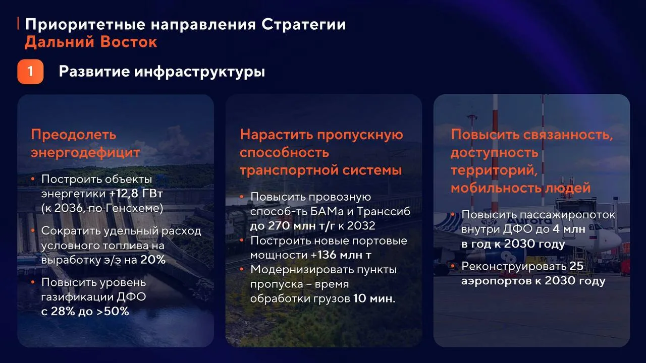 Развитие инфраструктуры. Новые электростанции, рост газификации, увеличение провозной способности БАМа и Транссиба, обновление аэропортов, приток инвестиций в регионы.