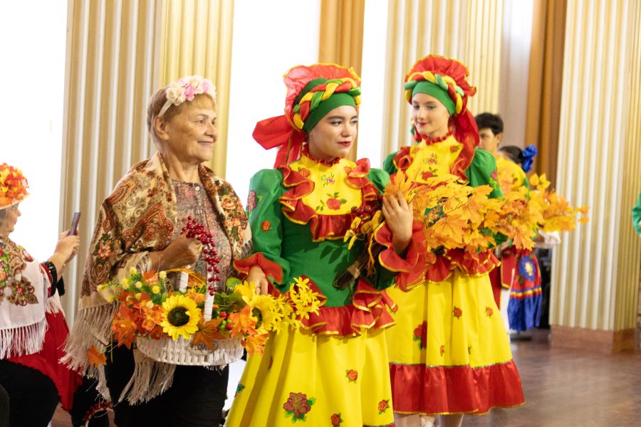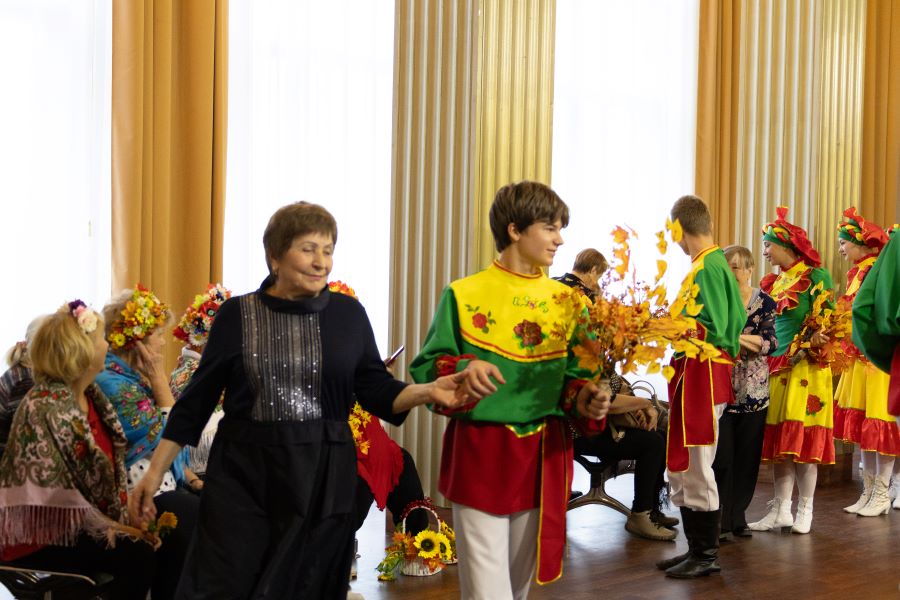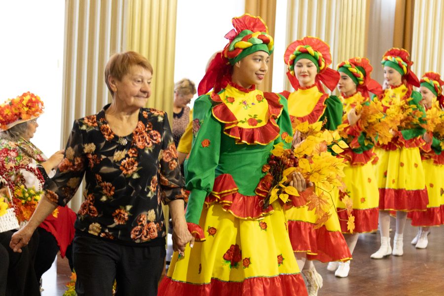 Помимо танцев гости праздника насладились песнями в исполнении талантливой Марины Лисовцовой. Под задорную музыку «Колымские звёздочки» вместе с пенсионерами совершили обряд, который, по поверьям, может избавить от болезней – прошли под рябиной. Позже все вместе присоединились к хороводу.