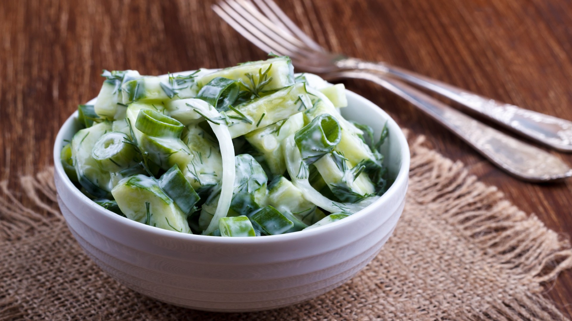 Нарежьте огурцы кубиками, добавьте к ним ломтики томата. Порежьте лук тонкими полукольцами, а чеснок — мелкими кусочками. Соедините овощи с измельченными петрушкой, укропом и мятой. Заправьте йогуртом или жирной сметаной, все перемешайте, делится дачным рецептом шеф-повар Василий Емельяненко на своем YouTube-канале.