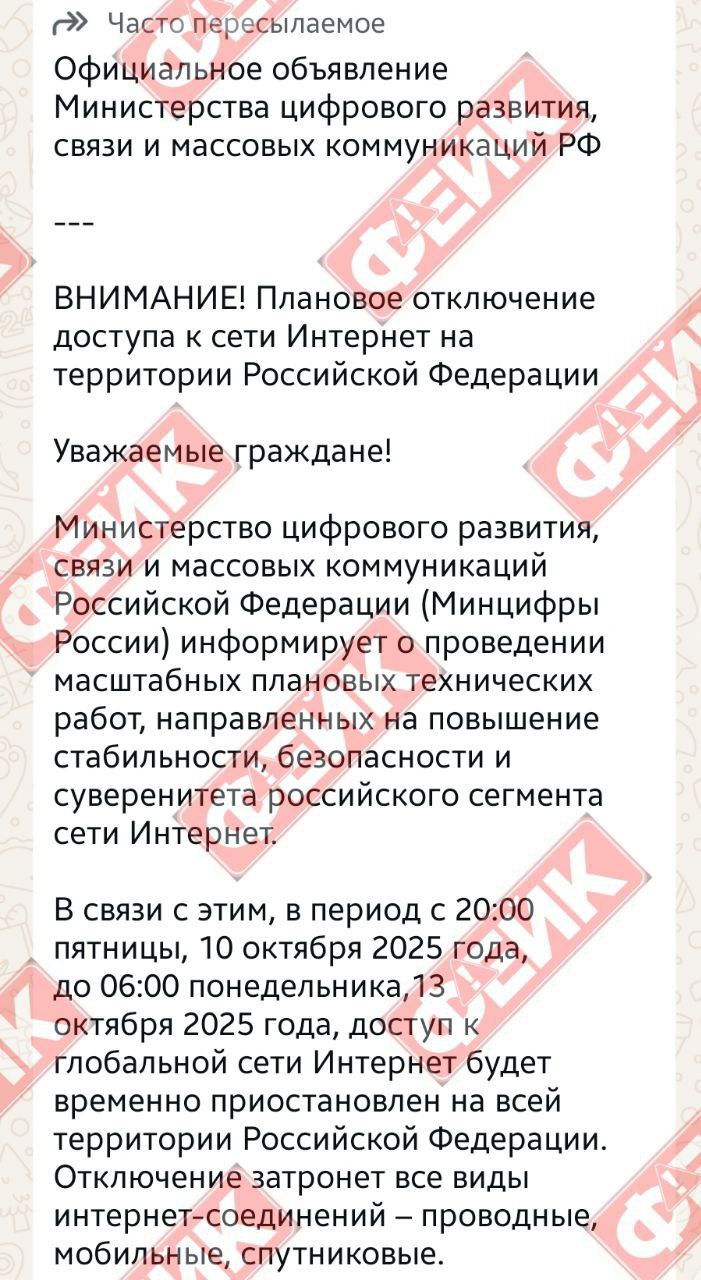 В соцсетях и WA-группах массово распространяется сообщение об ограничении в России доступа к интернету по всем видам соединений с пятницы по понедельник. Это – фейк!