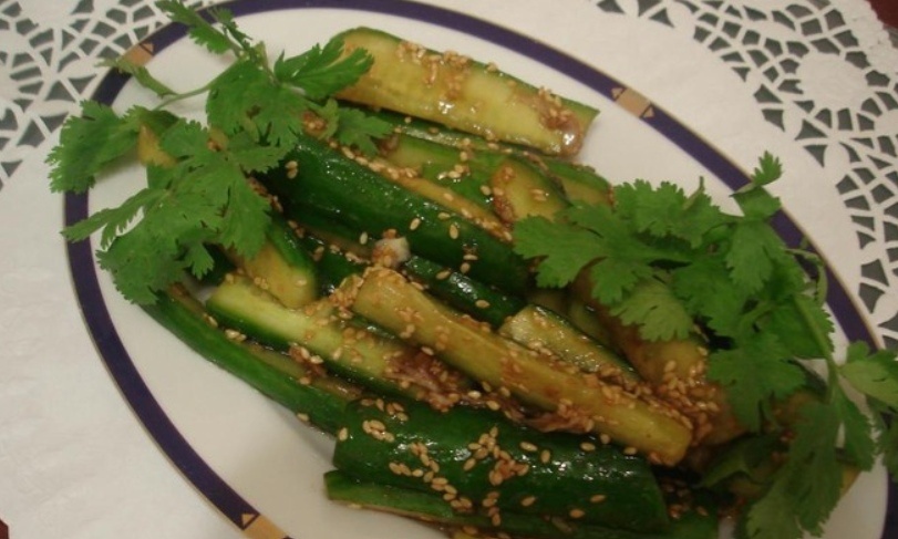 Чеснок выдавливается через пресс непосредственно на огурцы, затем добавляются жгучий перец, уксус и соевый соус. Внимание к деталям – это залог успеха!