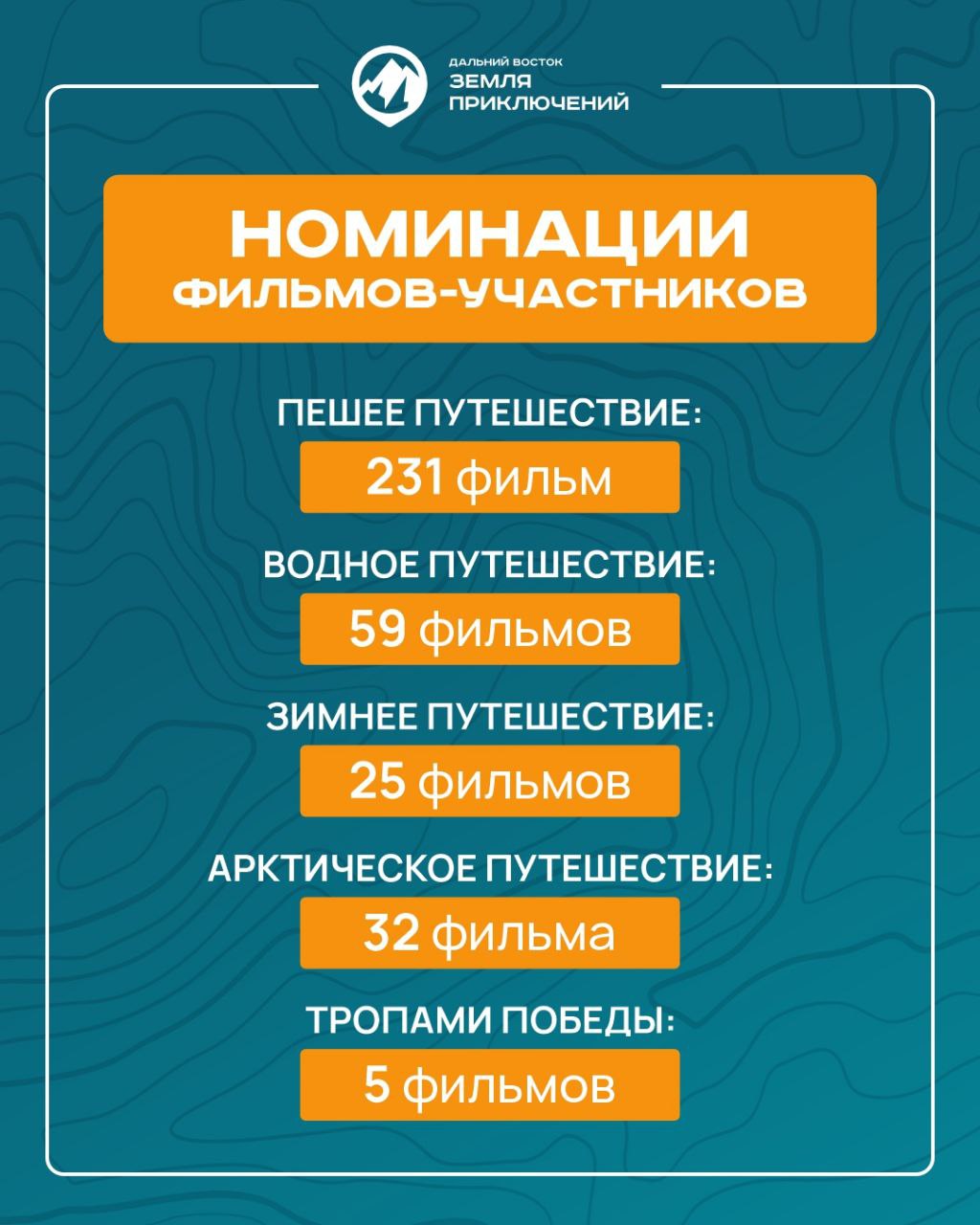Больше всего заявок поступило в номинации «Пешее путешествие» – 231 фильм. В номинацию «Водное путешествие» поступило 59 видеоработ, «Зимнее путешествие» – 25, «Арктическое путешествие» – 32 фильма. Кроме того, 5 работ отобрано для специальной номинации «Тропами Победы».