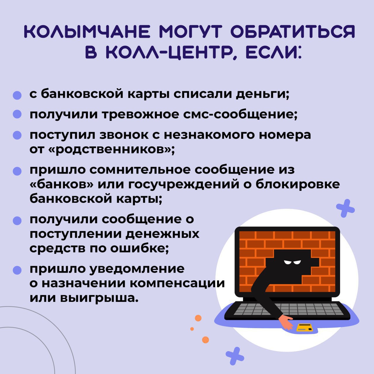 Жители Магаданской области могут обратиться в колл-центр, если с их банковской карты списали деньги, получили тревожное смс-сообщение или звонок с незнакомого номера от «родственников», сомнительное сообщение из «банков» или государственных учреждений о блокировке банковской карты или поступлении денежных средств по ошибке, а также уведомление о назначении компенсации или выигрыша. Также колымчане могут проконсультироваться по вопросу безопасности персональных данных.