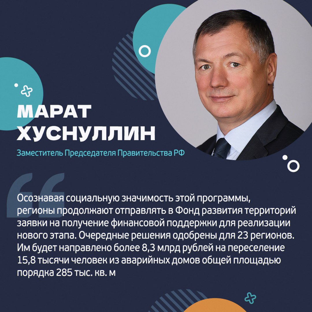 Всего новыми участниками программы стали 23 региона. Об этом сообщил вице-премьер, председатель наблюдательного совета Фонда развития территорий Марат Хуснуллин. Всего с 2025 по 2030 год в рамках нацпроекта «Инфраструктура для жизни» планируют переселить 345 тысяч человек из 6,2 млн кв. м аварийного жилья.