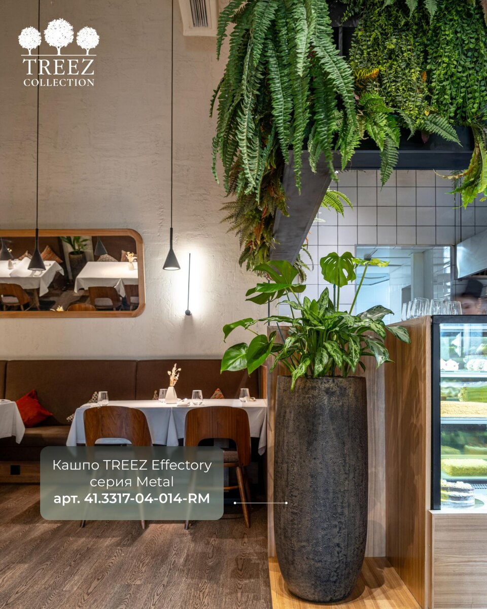 - Фито-декор: Особое внимание уделяется зеленым растениями. Кашпо Treez Effectory из металла с золотой патиной не только подчеркивает стиль, но и создает уютный климат.