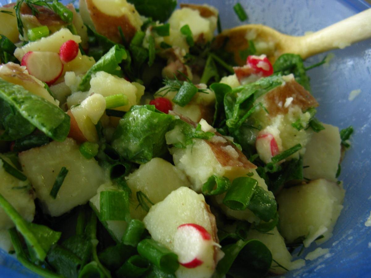Картофель отваривать до состояния мягкости, затем превратить в пюре, сохраняющее лёгкость, и смешать с нарезанными овощами, приправленными уксусом и сахаром. Главное здесь — аккуратное перемешивание, чтобы сохранить текстуру.