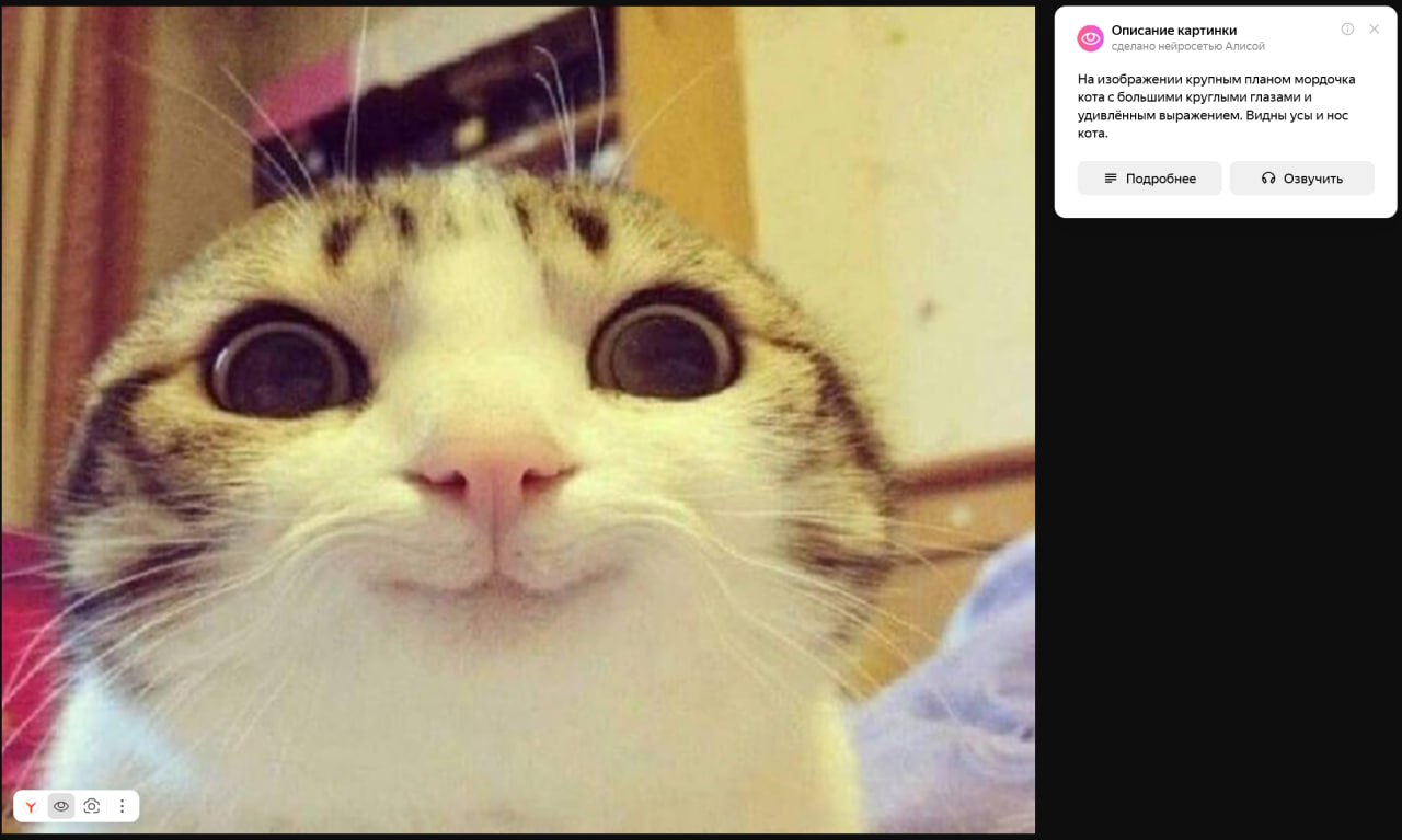 Теперь если у пользователя активирован скринридер, нейросеть автоматически генерирует описание при попадании фокуса на изображение. Как раз его и может озвучить программа. Фото товаров, цвет и фасон одежды — нейросеть расскажет всё. Даже ваши любимые мемы с котиками.