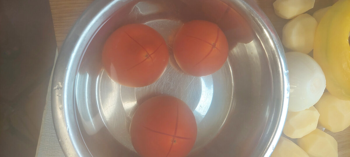 Первый шаг — подготовка овощей. Помидоры надо обдать кипятком и оставить на несколько минут для легкого снятия кожицы. Затем их необходимо нарезать дольками. Картошку следует нарезать на дольки, а морковь и болгарский перец — на брусочки. Луковицу можно нашинковать полукольцами для мягкости вкуса.