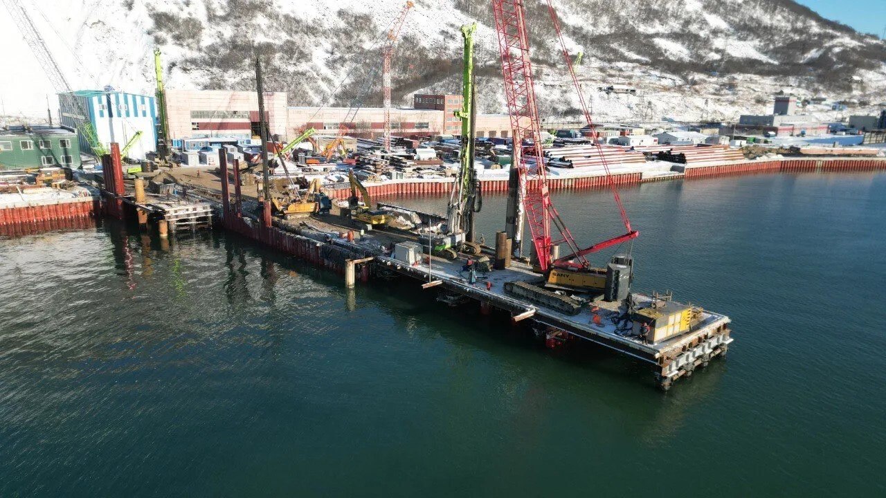 На оградительном моле идут работы нулевого и первого цикла. Организованы временные технологические площадки для размещения сверхтяжелой техники.