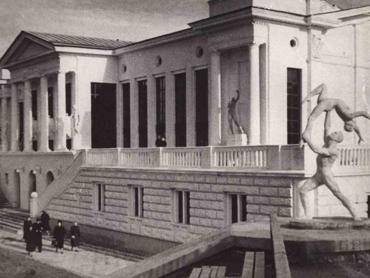Здание несет в себе черты неоклассицизма, его фасады украшены фризом, пилястрами, сандриками и лопатками. Кроме того, в начальном виде вдоль окон были расположены большие колонны и балкончики. Отдельно выделяется фасад со стороны стадиона. Там можно увидеть треугольный фронтон над входом, статуи, посвященные разным видам спорта, широкие лестницы и украшенные модульонами балконы.