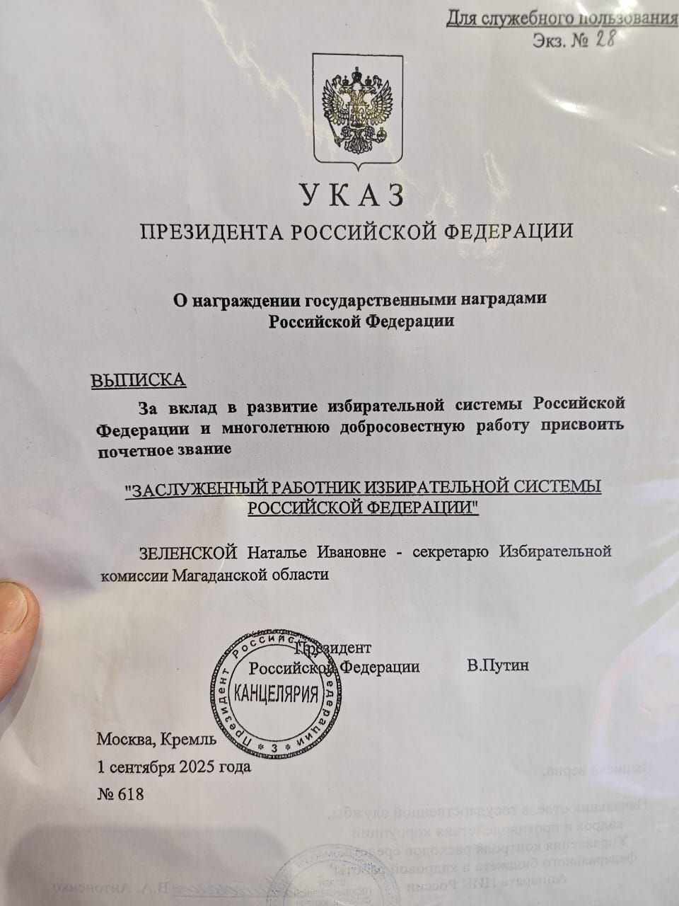 Секретарь Избирательной комиссии Магаданской области Наталья Зеленская стала первым в регионе обладателем почетного звания «Заслуженный работник избирательной системы Российской Федерации». Награду ей вручила председатель Центризбиркома России Элла Памфилова в ходе Всероссийского семинара-совещания.