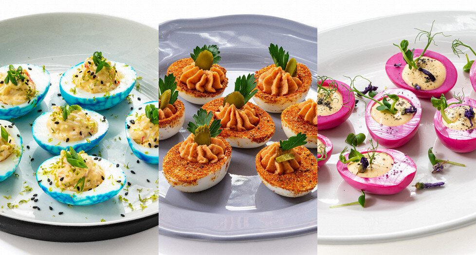 - С крабовыми палочками и васаби: Элегантные и изысканные, эти яйца украшены мраморным узором, который создается с помощью пищевого красителя. Внутри вас ждет начинка из крабовых палочек, желтков и масла с привкусом васаби.