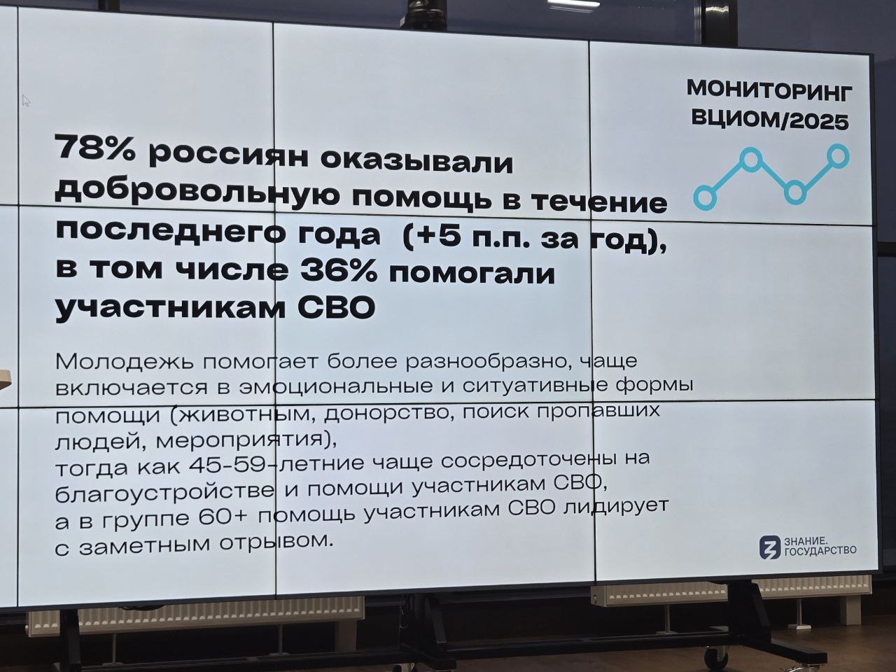 Современное волонтёрство — это уже далеко не разовые акции. Посмотрите на данные ВЦИОМа. 78% Россиян оказывали добровольную помощь за последний год. Это большая, сложная и системная работа. Особенно это видно сейчас, в деле помощи участникам СВО. Люди вкладывают в это силы, время, душу — абсолютно безвозмездно.