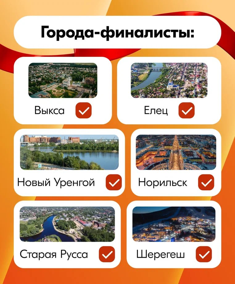 До 19 декабря на Госуслугах можно проголосовать за одного из шести финалистов: Выкса, Елец, Новый Уренгой, Норильск, Старая Русса, Шерегеш.