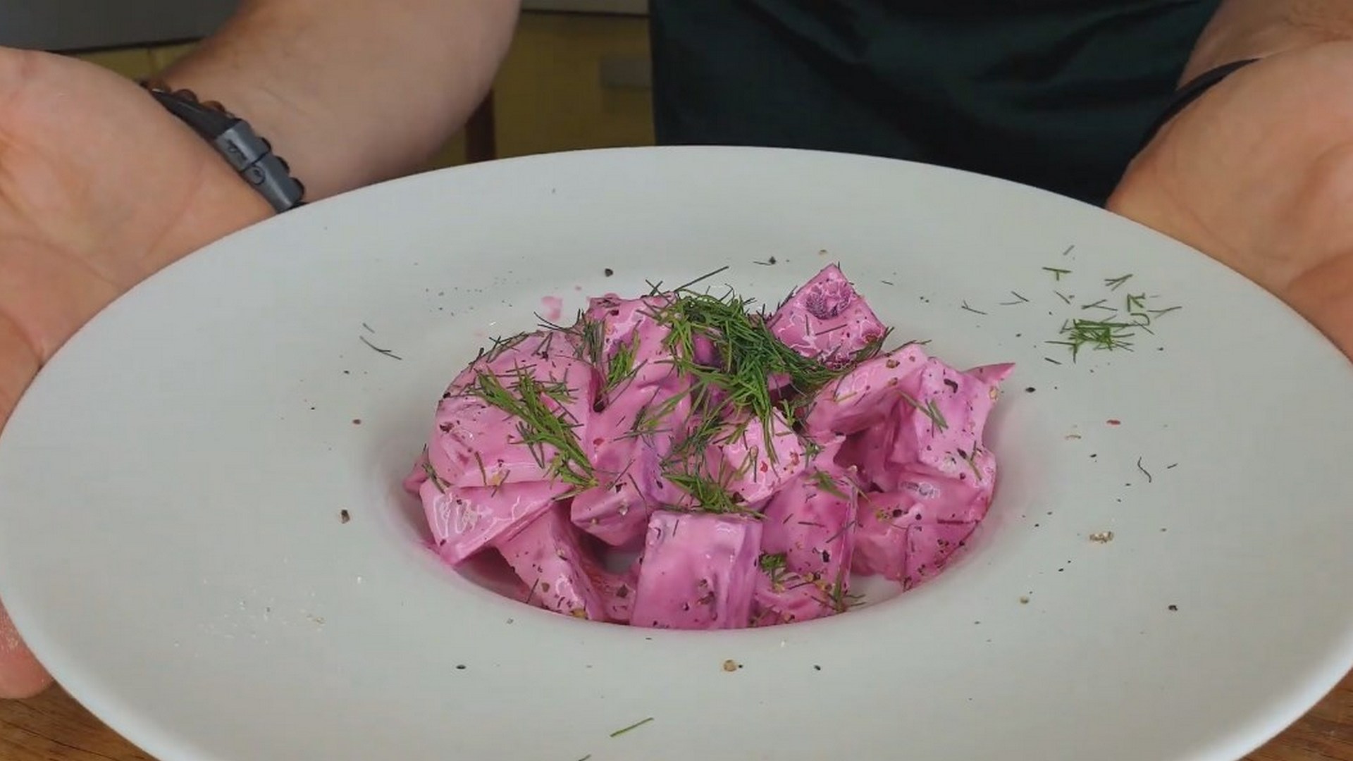 Сыр нарезаем кубиками, добавляем к овощам, затем поливаем сметаной, солим и перчим, после чего хорошенько перемешиваем. Из-за запеченной свеклы вкус получится пикантным и необычным, говорит автор YouTube-канала «Ресторан в хрущевке».