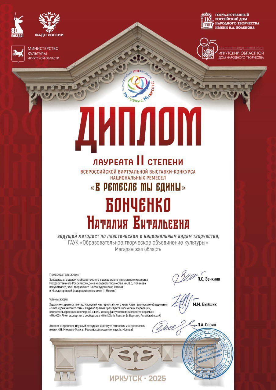 По итогам конкурса наши мастерицы Наталия Бонченко и Ирина Денисова удостоены Дипломов 2 степени! Поздравляем коллег и желаем новых интересных работ и громких творческих побед!