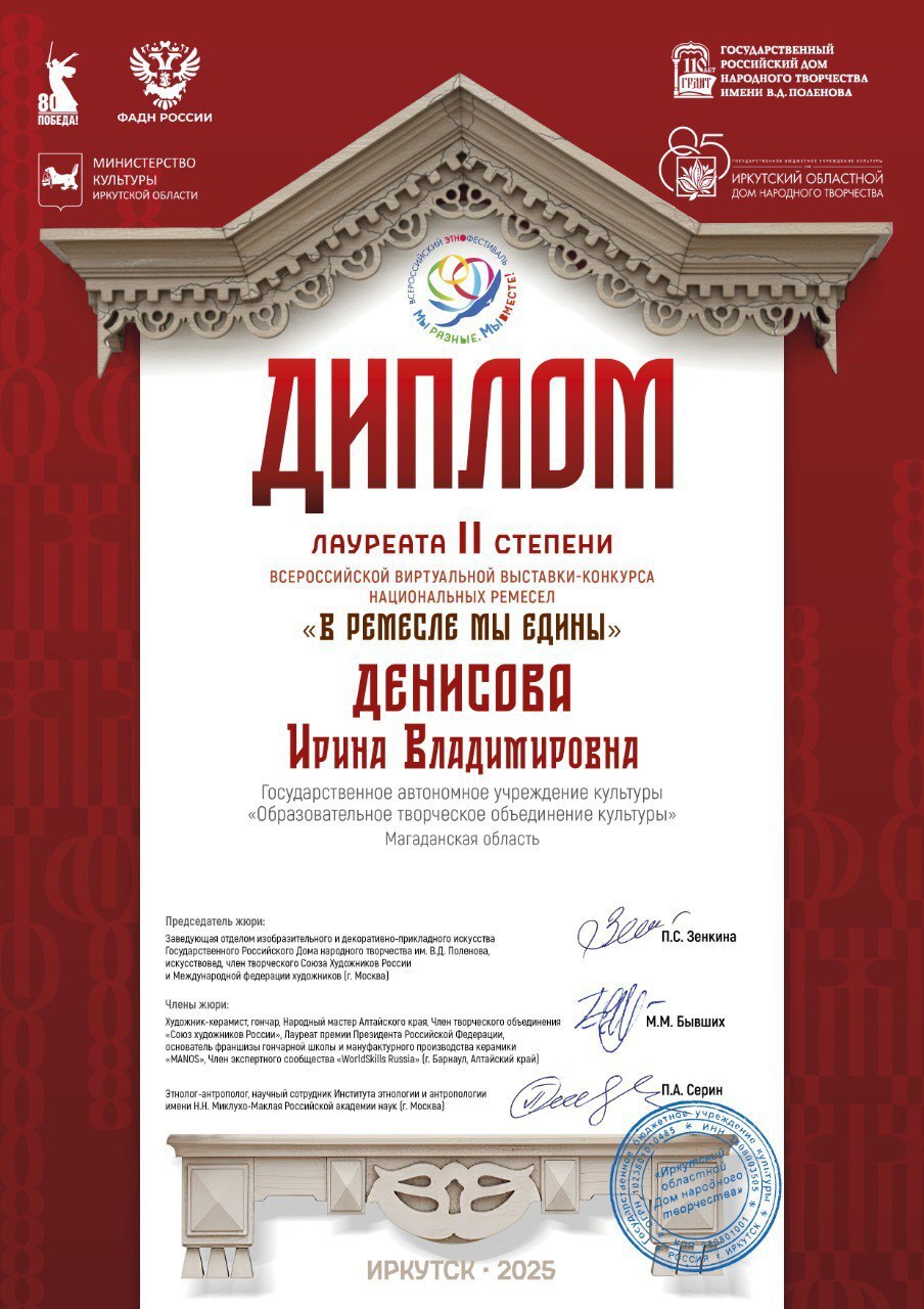 Ведущие методисты Центра народных художественных промыслов и ремесел приняли участие во Всероссийской виртуальной выставке-конкурсе национальных ремесел «В ремесле мы едины». Конкурс прошел в рамках Всероссийского этнокультурного фестиваля «Мы разные. Мы вместе», организованного Иркутским областным Домом народного творчества.