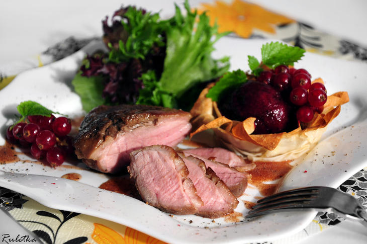 Теперь пора приступить к утке. На коже филе сделать надрезы, замариновать в соевом соусе и меде. Обжарить на раскаленной сковороде до румяной корочки с добавлением розмарина и чеснока, а затем довести до нужной прожарки в духовке. Готовое филе подать с ароматным соусом, приготовленным из сковороды, и микс-салатом.