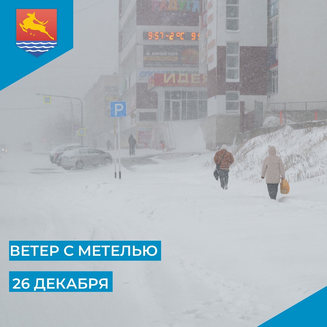 Сутки 26 декабря в Магадане ожидается восточный ветер 15-20 м/с с метелью.