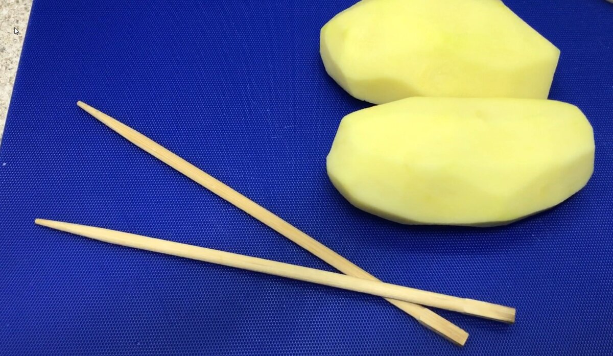 1. Для начала выбираются картофелины одинакового размера, что обеспечит равномерное приготовление. Очищенные картошки тщательно моются — если используются молодые клубни, кожуру можно оставить. Далее, с помощью ножа выполнить аккуратные поперечные надрезы по полсантиметра. Чтобы не разрезать картошку полностью, можно использовать палочки для суши, которые будут служить опорой.
