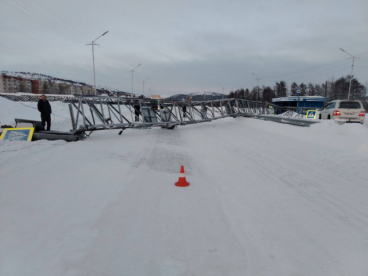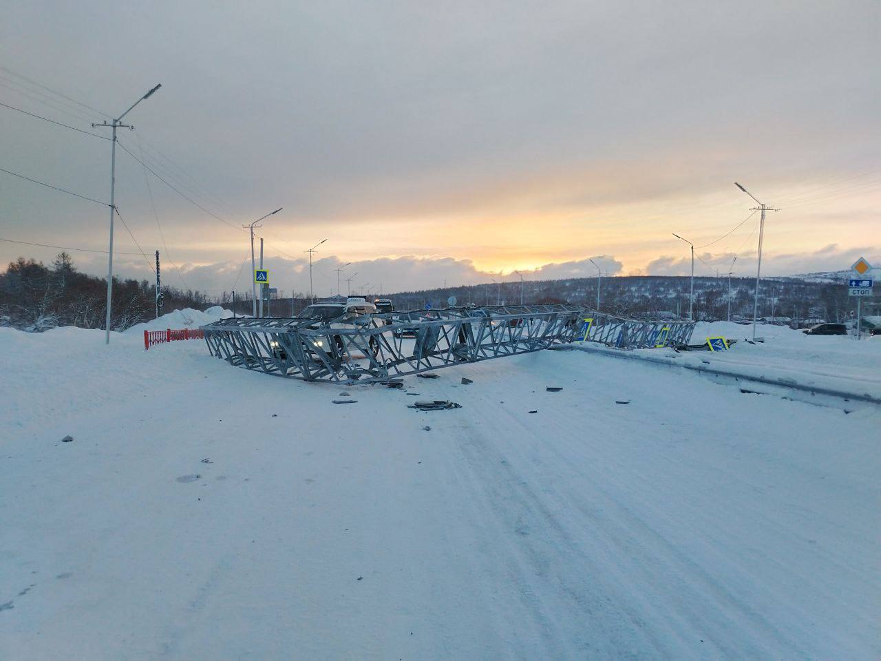 ГАИ: Днем 29 декабря возле поселка Снежный 30-летний водитель большегруза «Мерседес» в составе полуприцепа, осуществляя перевозку экскаватора, совершил наезд на светофорный объект. В результате конструкция обрушилась на проезжую часть.