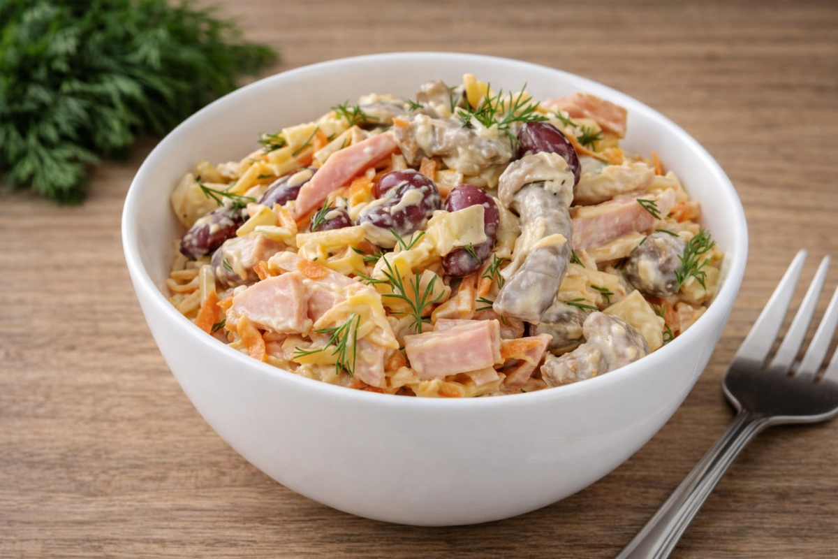 Что делает салат «Париж» таким привлекательным, так это его сбалансированный вкус. Каждый ингредиент гармонично дополняет друг друга: фасоль добавляет сытности, ветчина придаёт насыщенность, грибы дарят аромат, а сыр завершает общий вкус. Лук и морковь привносят в блюдо свежесть и лёгкую сладость, а укроп оборачивает всё в уютный, домашний аромат.