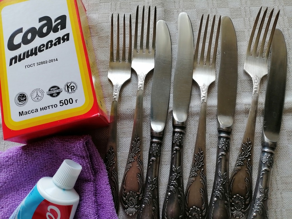 Растворить в литре горячей воды по одной столовой ложке соды и соли. Мельхиоровые приборы поместить в раствор на 20-30 минут. Опционально можно добавить кусочек фольги, что улучшит результат. После замачивания аккуратно протереть мягкой тряпочкой и ополоснуть под чистой водой.