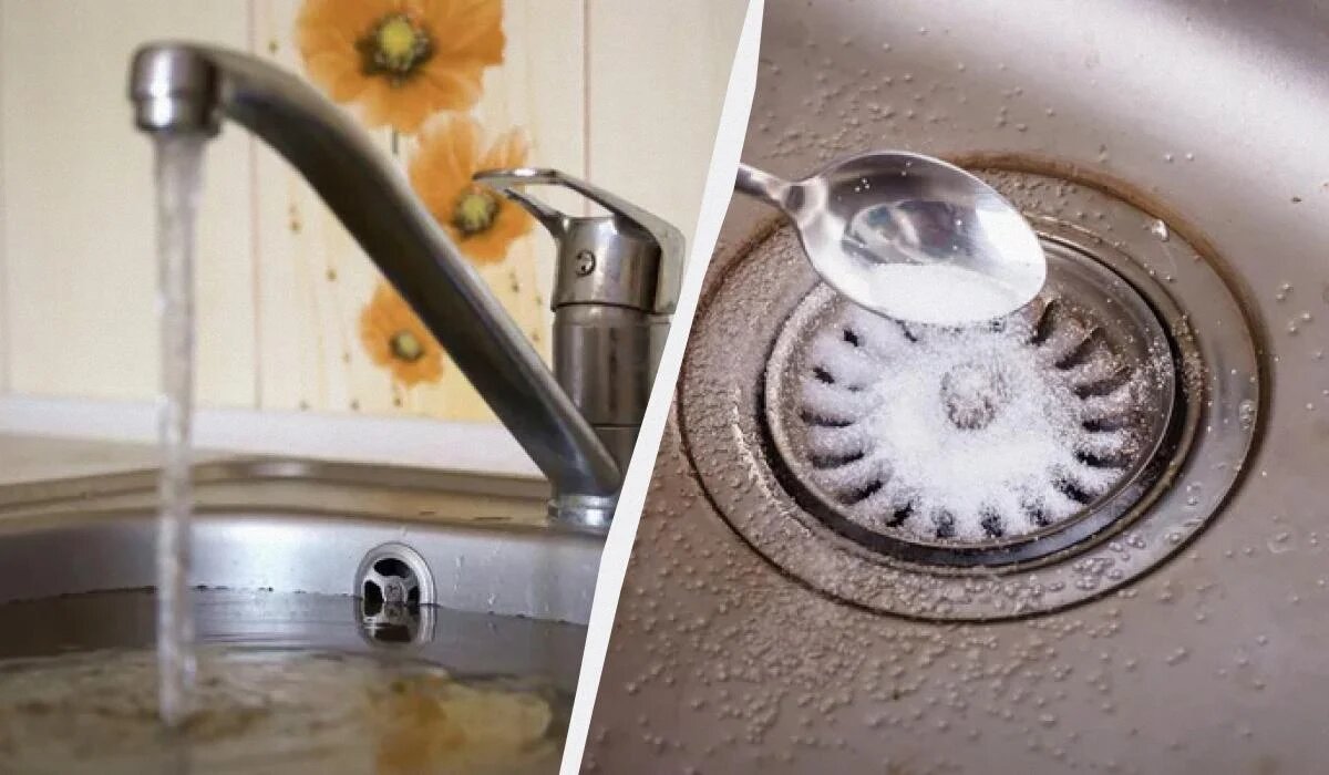 - Соль и сода: смешайте два ингредиента в равных пропорциях и засыпьте в слив. Оставьте на 15 минут, а затем промойте горячей водой.