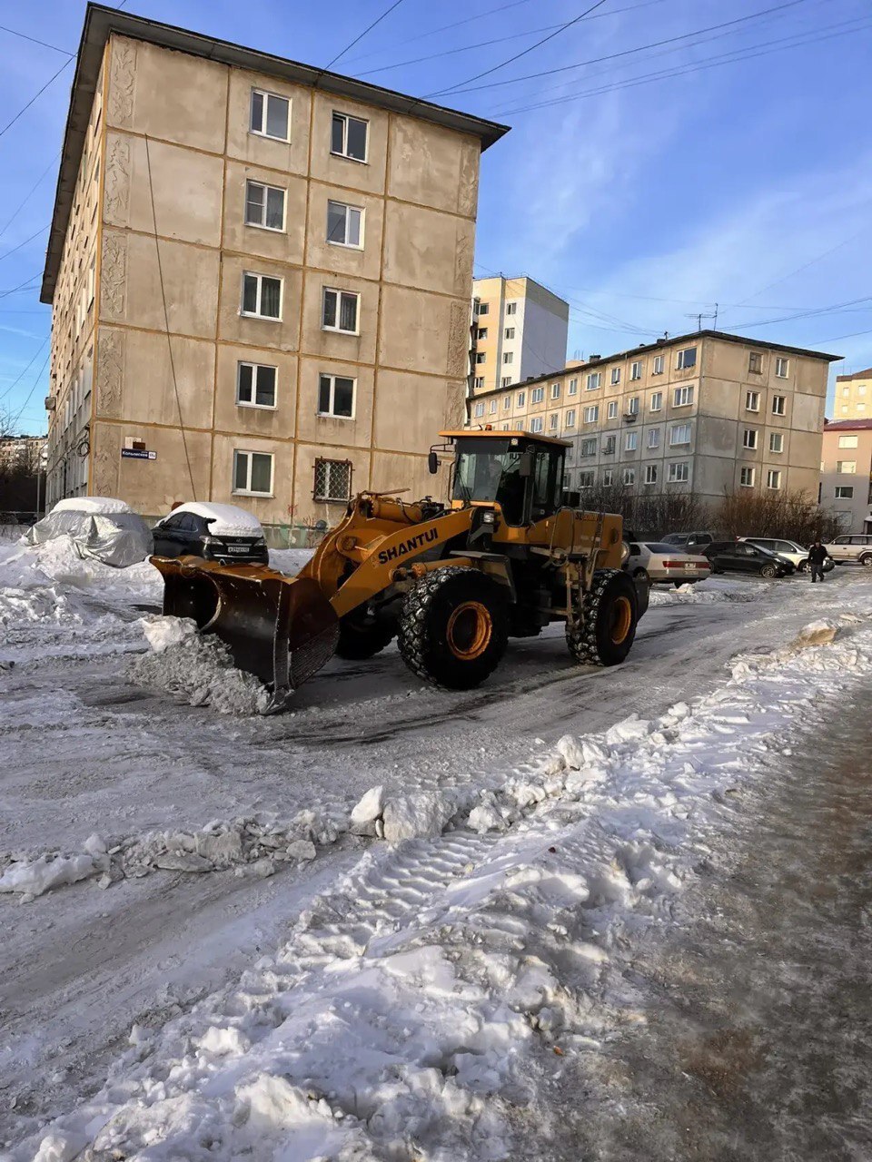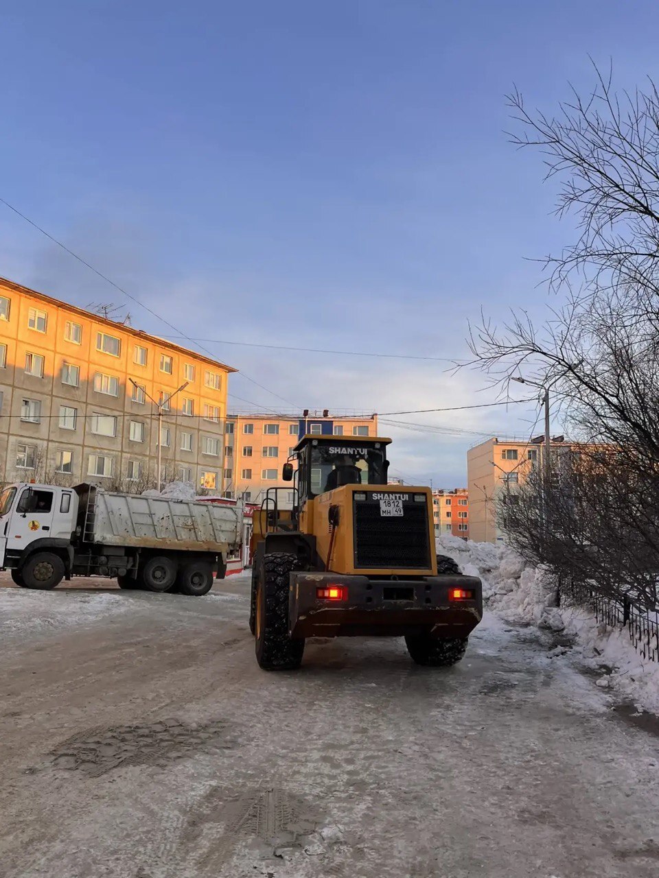 погрузчики снимают накат с тротуаров на Транспортной, Болдырева, в проезде Вострецова, на Колымском шоссе;