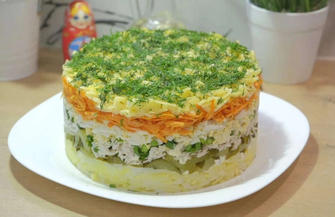 Этот салат — идеальный выбор для любого праздничного стола, способный удивить гостей и порадовать близких. Слоеная структура придает ему эффектный вид, а сочетание вкусов сделает его настоящим фаворитом.