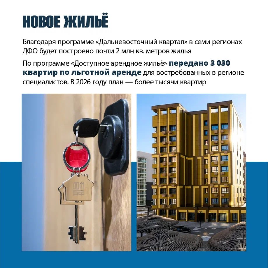 По программе «Дальневосточный квартал» в ДФО планируется 2 млн кв. м жилья. Более трех тысяч семей специалистов получили квартиры по льготной аренде.
