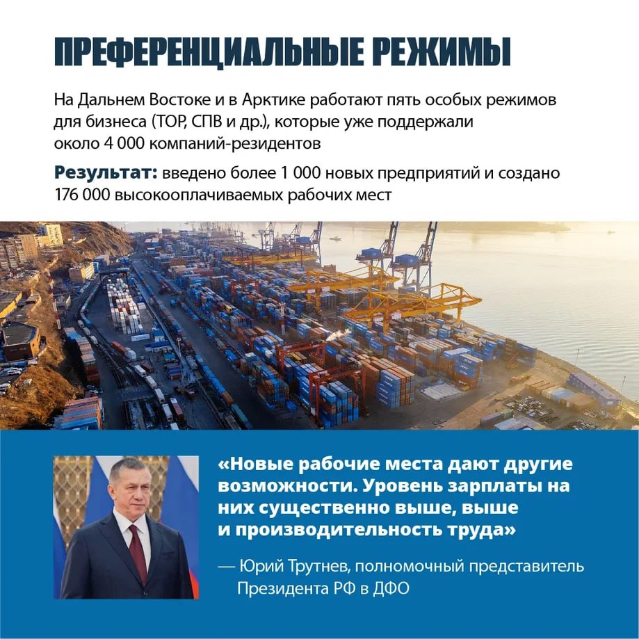За 10 лет приток капитала на Дальний Восток в 1,5 раза выше, чем в среднем по России. Поддержано около четырех тысяч проектов, создано 176 тысяч рабочих мест с высокой зарплатой.